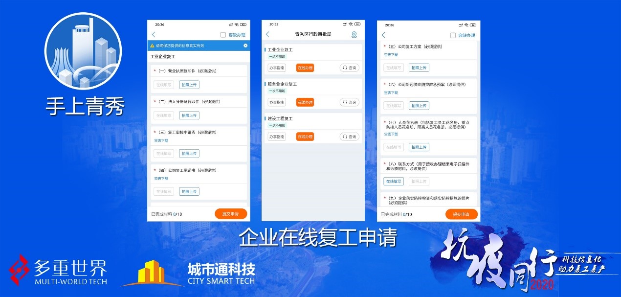 在青秀区政府的工作指导下,我们第一时间在“手上青秀APP”上发布了抗疫专题栏目,配合青秀区审批局增加了线上企业复工审批事项,让企业“一次不用跑”就可在手机上办完相关审批事项,极大的方便了企业、政府的工作人员的工作,也减少了疫情传播的风险。