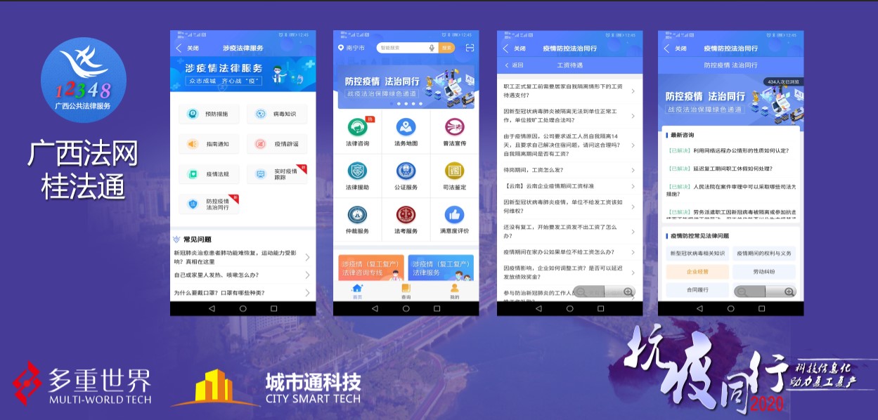 针对疫情过程中薪酬、劳务纠纷呈现暴发性增长趋势,为了更好保护劳动者的权益,我司还积极配合广西司法厅,在“广西法网·桂法通” APP上推出“涉疫情(复工复产)法律咨询、服务”栏目,并承接了广西法网12348公共法律服务平台的运维工作,组织了大量的在线咨询律师免费接听社会大众的法律咨询电话,有效缓解了社会矛盾的影响,为维护社会安定起到了积极作用。