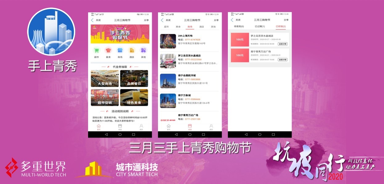 为了促进社会经济复苏、刺激消费增长,我们还受青秀区经济贸易和信息化局的委托,联合开发“三月三手上青秀购物节”活动,吸引了广大市民前来领取购物优惠券,为促进消费增长助力商家企业共渡难关。